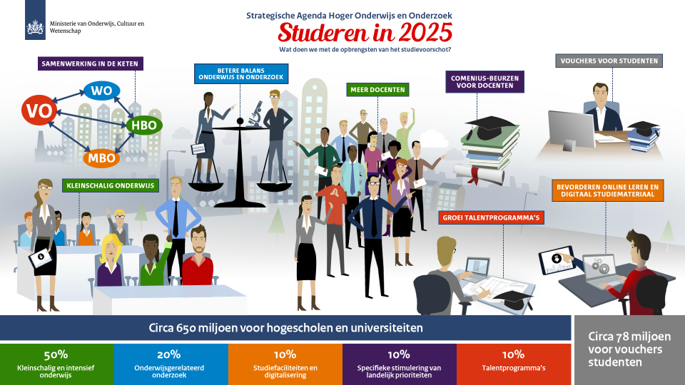 Niet minder dan vierduizend extra docenten moeten er in 2025 bijgekomen zijn in het hoger onderwijs. Dat staat in de Strategische Agenda Hoger Onderwijs die Jet Bussemaker vandaag presenteerde. Het geld daarvoor komt vrij door het vervangen van de basisbeurs door een leenstelsel. De minister moet overigens eerst nog in gesprek met de universiteiten en de hogescholen om te zorgen dat het geld ook daadwerkelijk op de juiste plek terechtkomt.